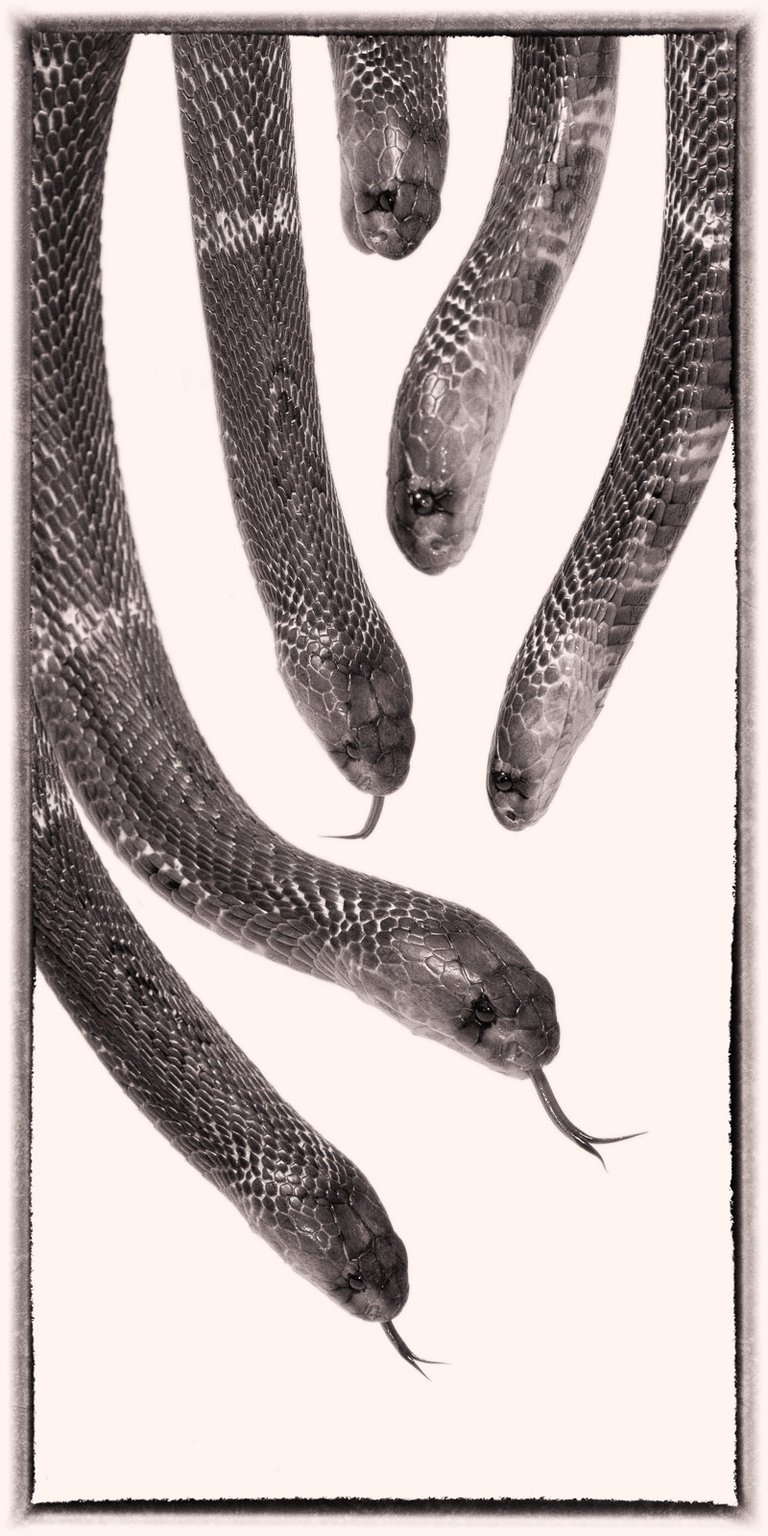 Une chevelure faite de serpents sifflants, un visage pétrifiant tout mortel qui le regarde, cet être extrêmement dangereux est Méduse. Elle finira décapitée par Persée. Du point de vue de l’historien, Méduse fut sans doute une reine d’une grande valeur guerrière. L’histoire de Méduse, comme celle des Amazones combattues par Héraclès, est le faible écho relictuel d’anciens conflits opposant des peuples patriarcaux à des peuples matriarcaux. Symboliquement, ces “Héros” mettent un terme aux derniers royaumes dirigés par des femmes. Ce thème se retrouve dans d’autres civilisations (Égypte, Indonésie, Chine, Japon, Aztèque) révélant ainsi le combat universel que font les hommes aux femmes.