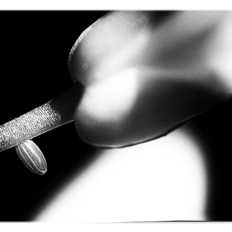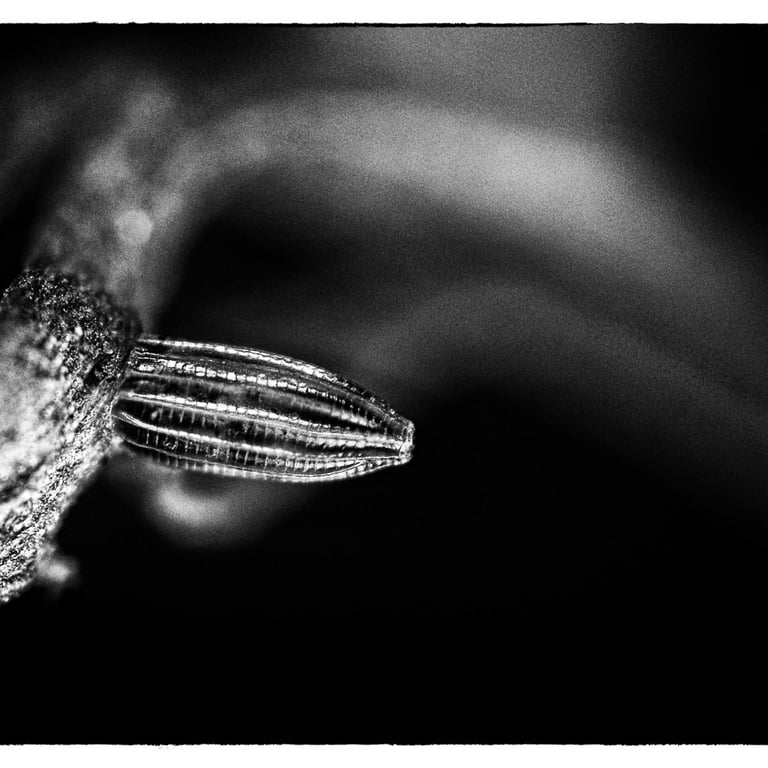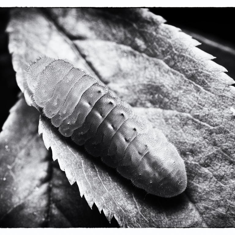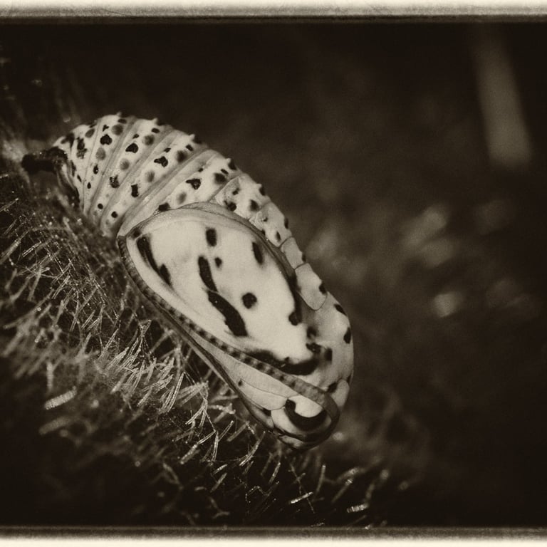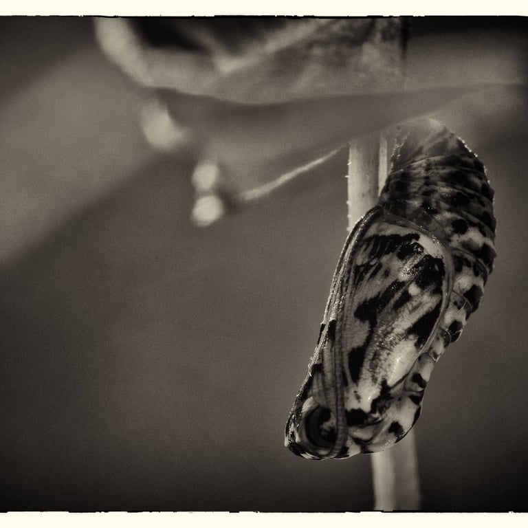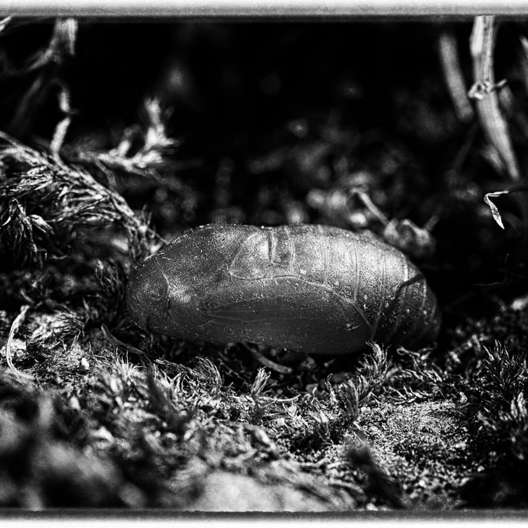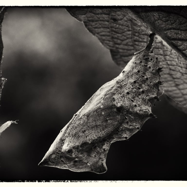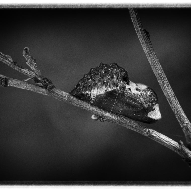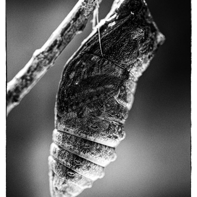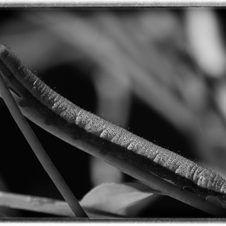 Animaux colorés et volants, les papillons symbolisent l’image parfaite de la légèreté et de l’insouciance. Mais avant leur métamorphose, qui sont-ils ? Œuf, chenille, chrysalide sont les trois états méconnus que ces insectes vont vivre avant leur renaissance aérienne. Pour magnifier ces moments vécus dans l’obscurité, cachés à l’ombre des plantes, le choix d’un Noir et Blanc dense et contrasté s’est imposé par l’esthétisme qu’il procure à ses moments de vie ingrats.